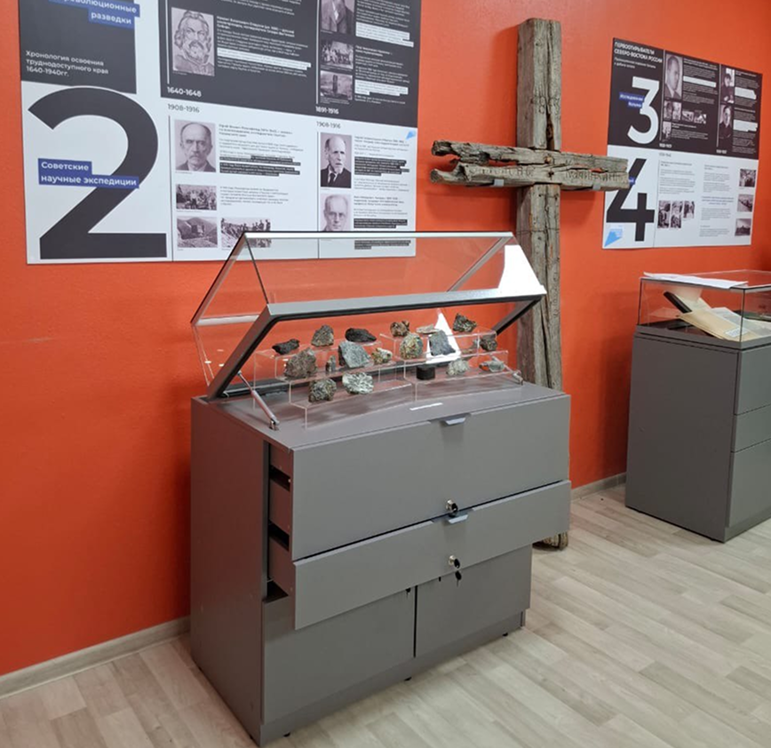 Продумываем задники с печатью, ячейки под ключевые экспонаты, подставки и подвесы - так, чтобы витрина усиливала тему зала
