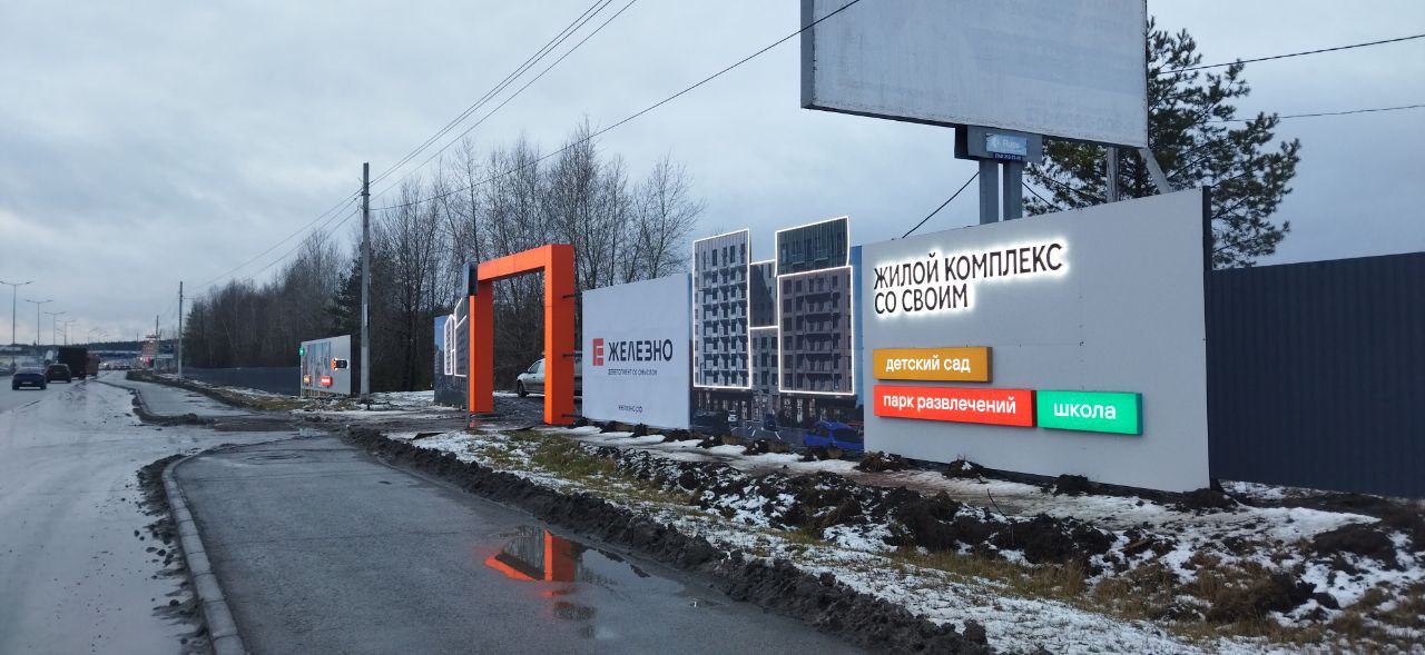 Оформили стройплощадку для «Железно»: забор стал работающей рекламой. Фирменная арка, подсветка и лаконичные баннеры повысили узнаваемость ЖК и создали притяжение для покупателей прямо у дороги.