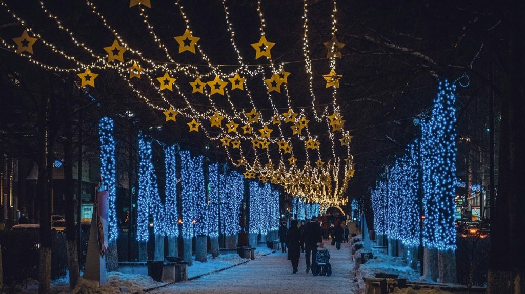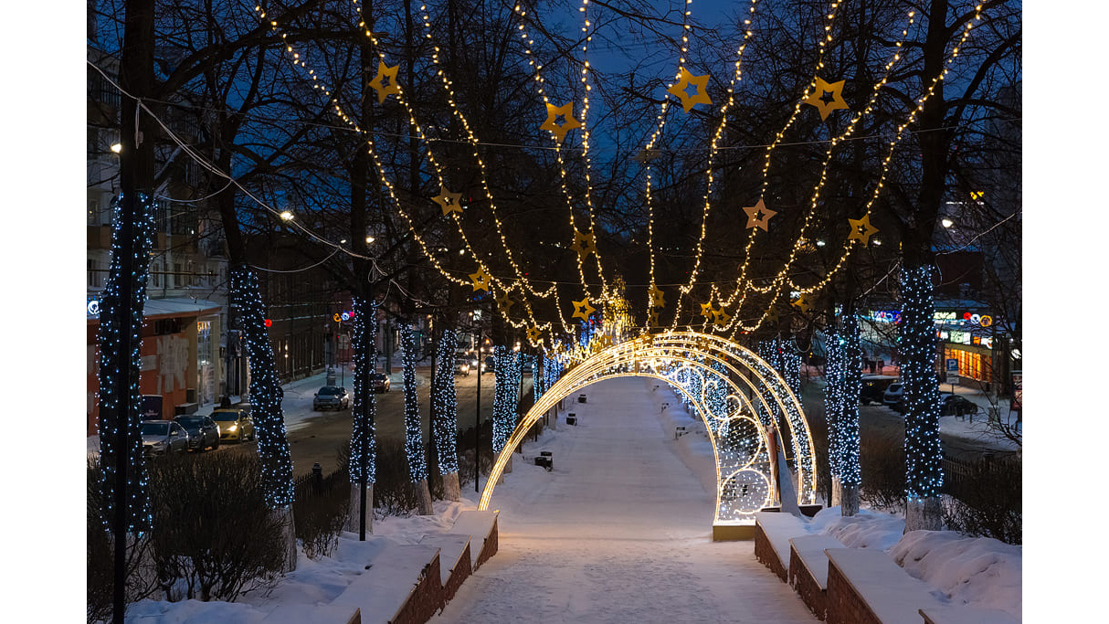 Зимой, при отсутствии приятно шумящей листвы деревьев, сохранить статус любимого места для прогулок жителей и гостей города помогает новогоднее световое оформление.