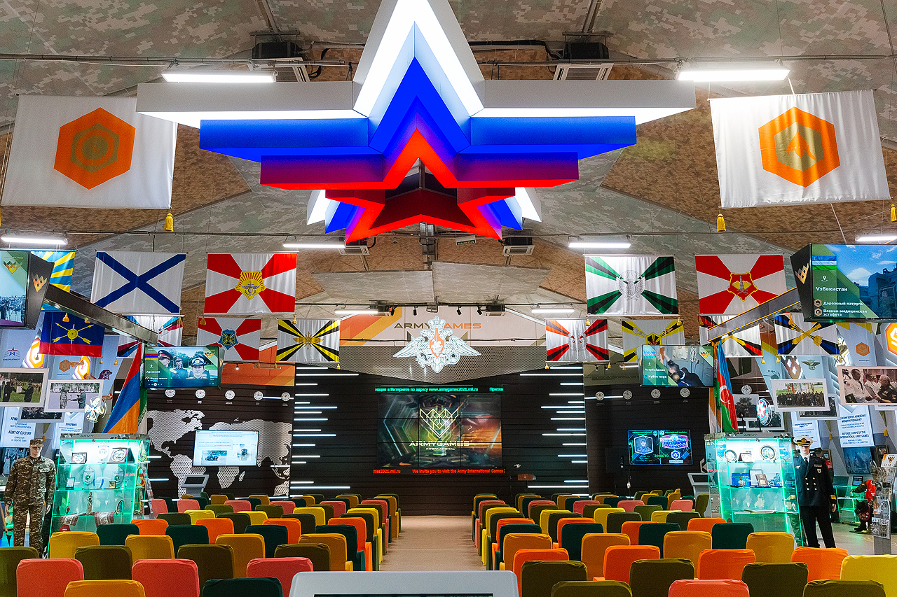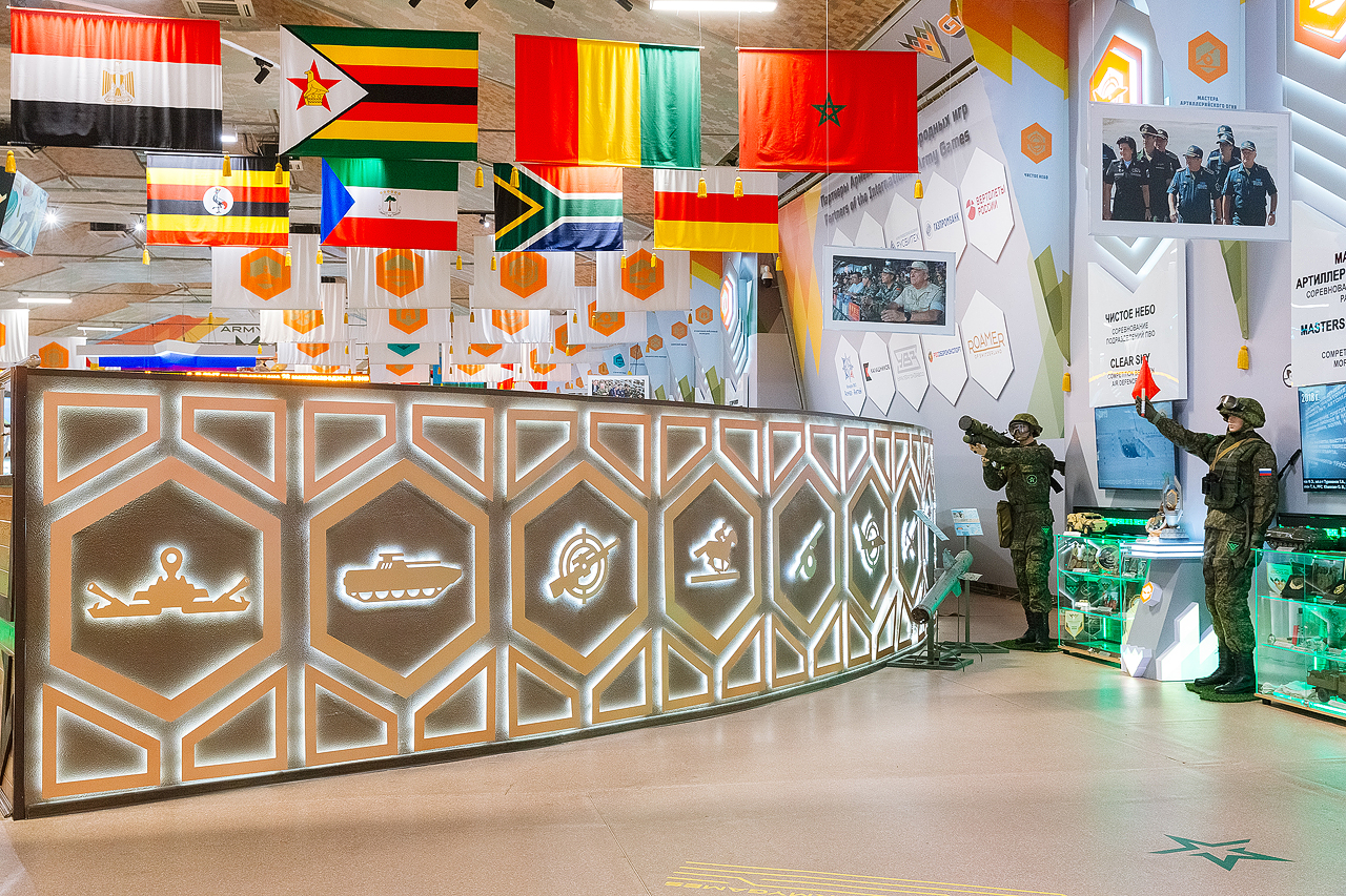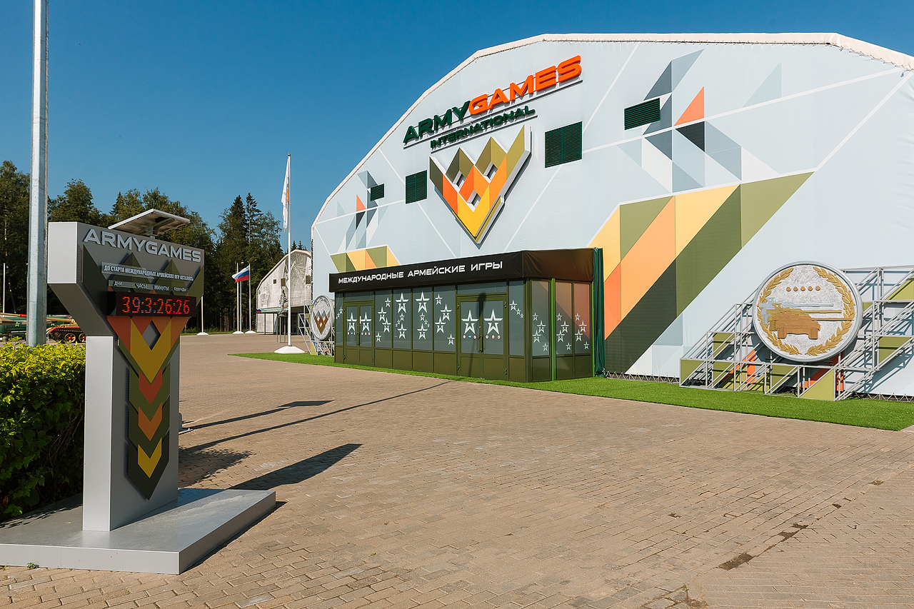 Внешнее оформление: По периметру фасада павильона были установлены объемные фигуры военной техники, входа украшались большими светодиодными буквами с названием "Army Games". Внешняя отделка была выполнена посредством печати баннеров, закрепленных на каркасе.
