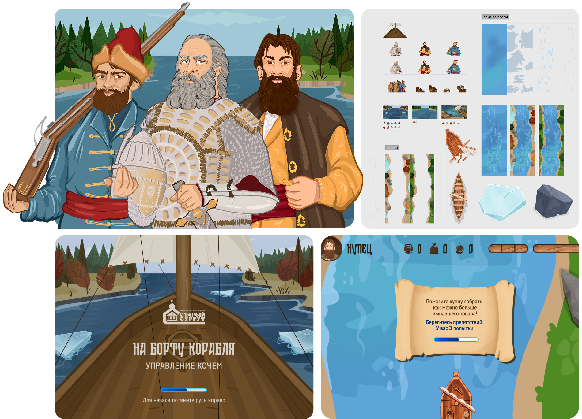 Вся графика и анимация выполнены вручную иллюстратором - визуальный стиль единый, детализированный и исторически выверенный. Отдельное внимание уделено предметам быта и пушнине: изображения животных и товаров адаптированы под локальную фауну региона.