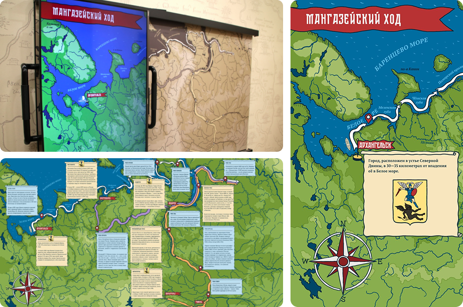 На экране разворачиваются анимированные сцены развития исторического поморского морского и речного пути XVII века, соединявший Русский Север (устье Северной Двины) с Сибирью, через Карское море, Тазовскую губу и реку Таз до города Мангазея, являвшегося центром торговли пушниной.