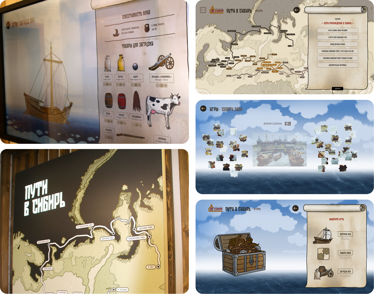 Комплекс содержит большой информационный блок о путях, быте и условиях передвижения, а также обучающие игры: сборку коча из элементов по архивным изображениям и игру на загрузку коча — необходимо правильно распределить груз весом 300 кг (в пудах).