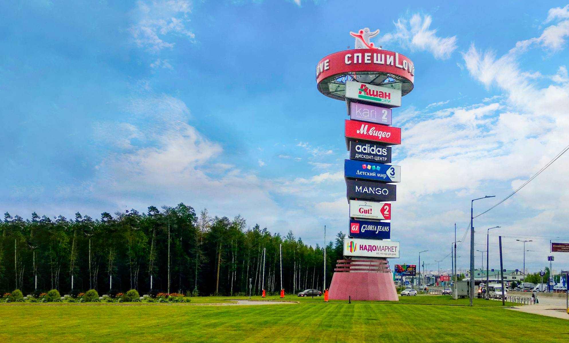 Главная задача стелы — привлечь внимание прохожих и проинформировать о магазинах и услугах, представленных внутри ТРК. Это яркий символ ТРК, видимый издалека благодаря высоте 35 метров и выгодному расположению рядом с оживленной магистралью.