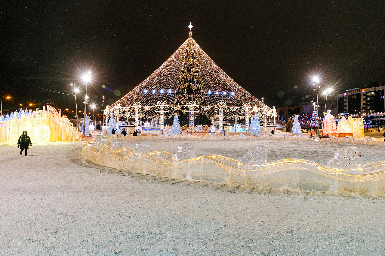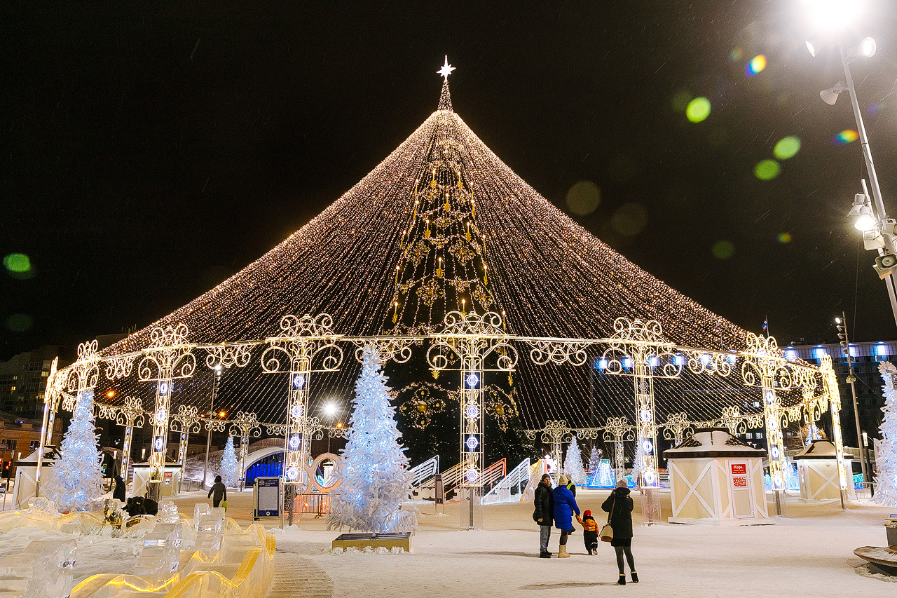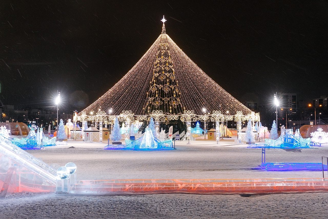 Монтаж городской ели с уникальной подсветкой и оформлением на центральной праздничной площадке города.