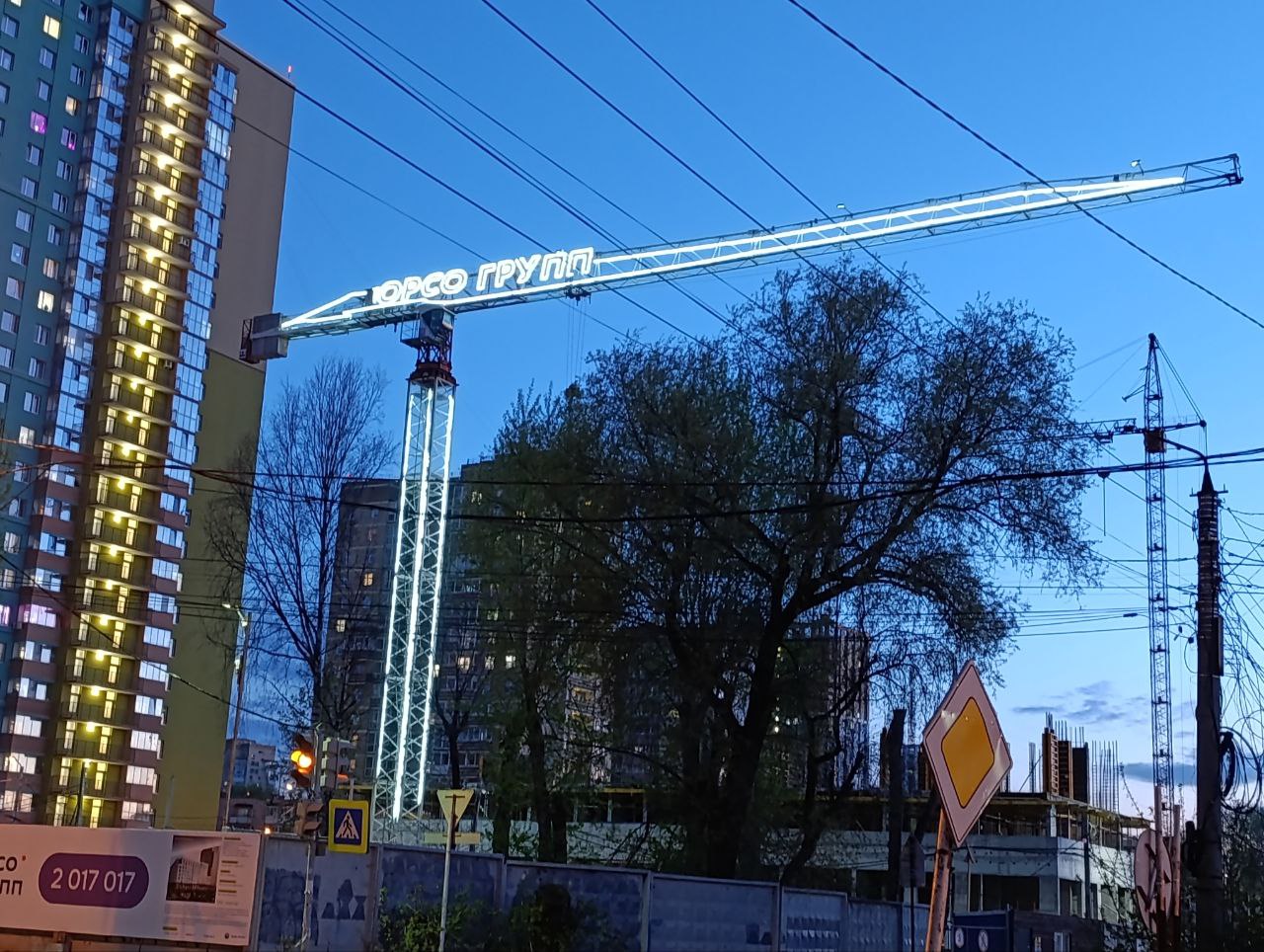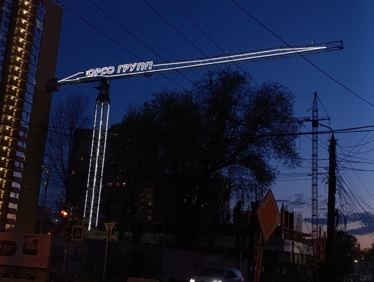 Использовать башенный кран как доминирующий рекламный носитель, сделав бренд застройщика самой заметной «звездой» в ночном городе.