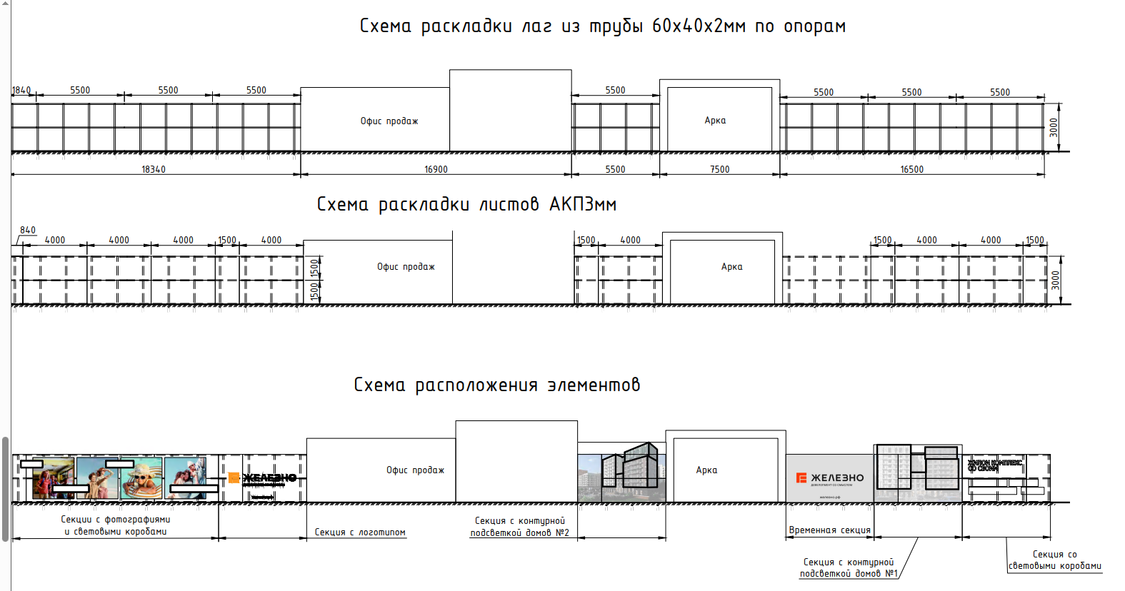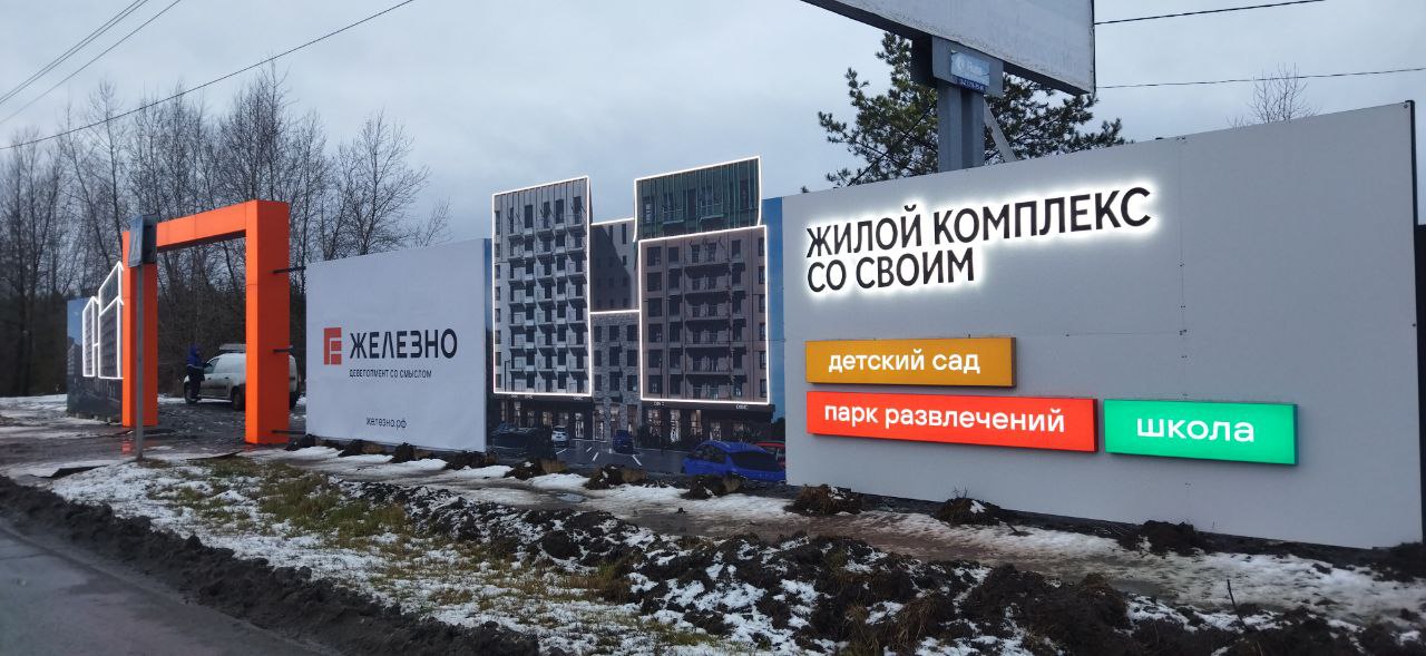 Оформили стройплощадку для «Железно»: забор стал работающей рекламой. Фирменная арка, подсветка и лаконичные баннеры повысили узнаваемость ЖК и создали притяжение для покупателей прямо у дороги.
