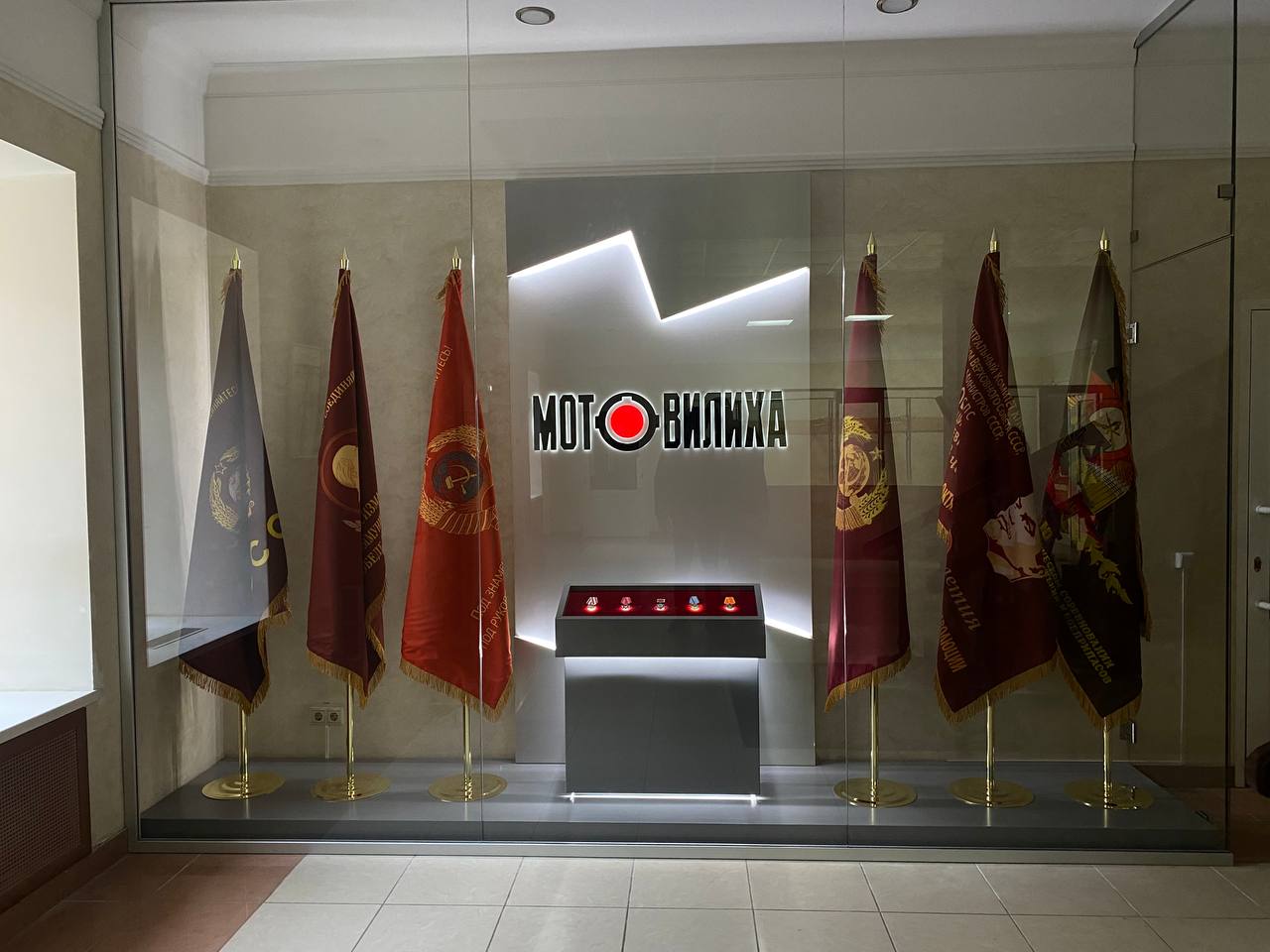 Этот персональный элемент интерьера стал достойным обрамлением исторических наград и знамен Мотовилихинских заводов. Все элементы (знамена, ордена, подставки) были предоставлены заказчиком, а наша задача заключалась в разработке и изготовлении защитной конструкции с художественным освещением, которая сохраняет и подчеркивает значимость реликвий.