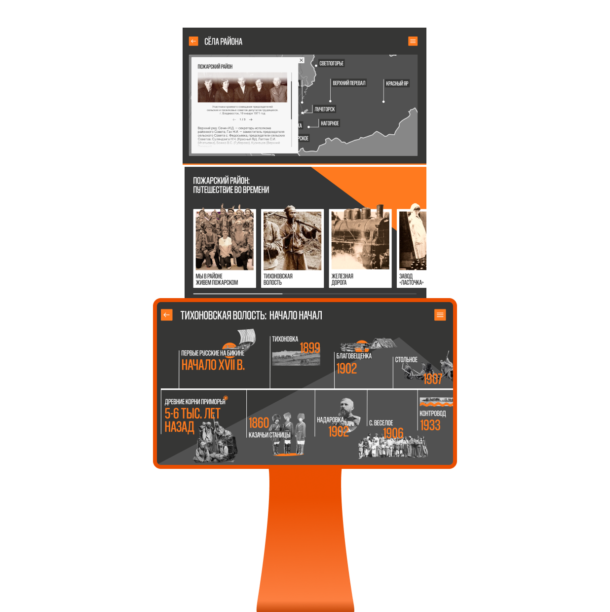 Для проекта было разработано индивидуальное программное обеспечение с продуманной структурой экранов и сценариев. Мы проработали разные форматы подачи информации, чтобы сложные и объёмные данные были максимально наглядными и доступными для посетителей разных возрастов. Контент охватывает историю Пожарского района в полном объёме — от этапов становления до современной жизни. Материал структурирован по ключевым темам и сферам, формируя цельный и понятный рассказ о территории.